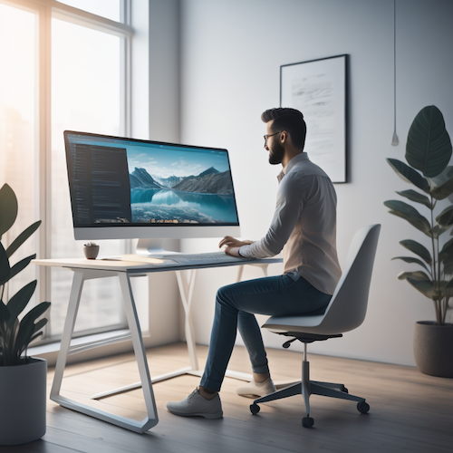 • A vibrantly lit workspace with a modern and ergonomic standing desk. A person dressed in comfortable and stylish attire sits comfortably at the desk, using a 3D modeling software on a large computer screen. The person’s posture is upright and relaxed, indicating the positive impact of 3D modeling on overall physique. The surrounding environment is clean and organized, reflecting the meticulous nature of 3D modeling. The overall image conveys a sense of creativity, innovation, and well-being, aligning with the theme of Proposition 1.